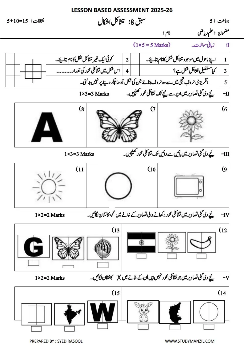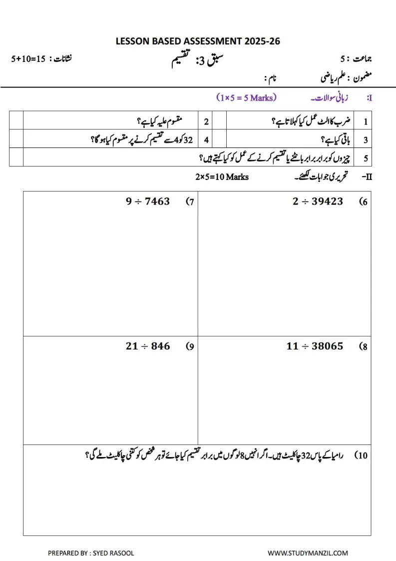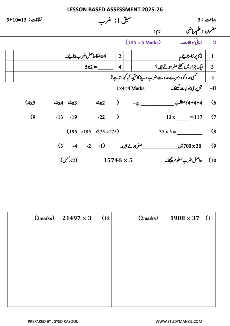 LBA Class 5 Maths Unit Test Papers in Urdu